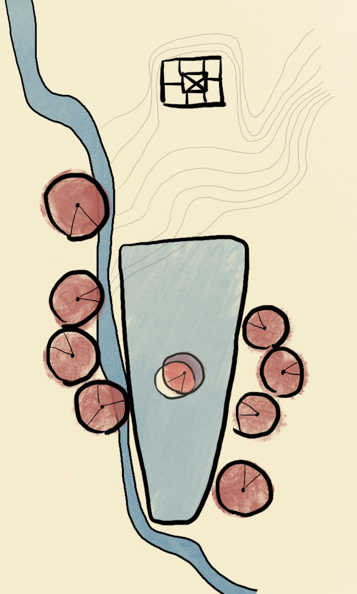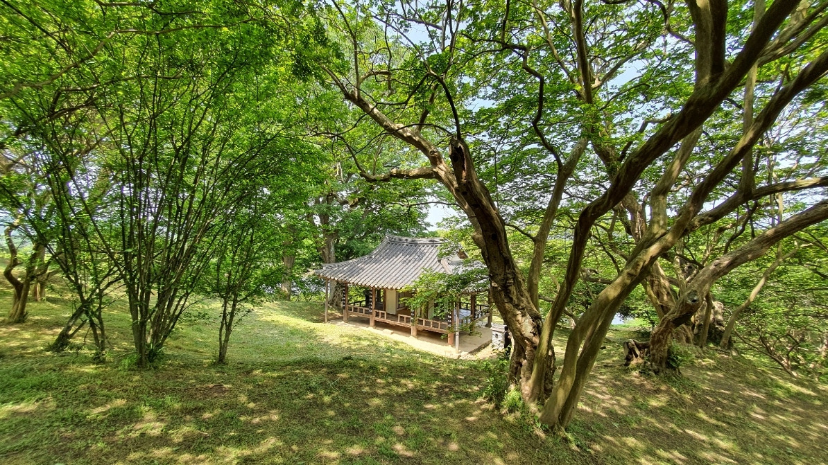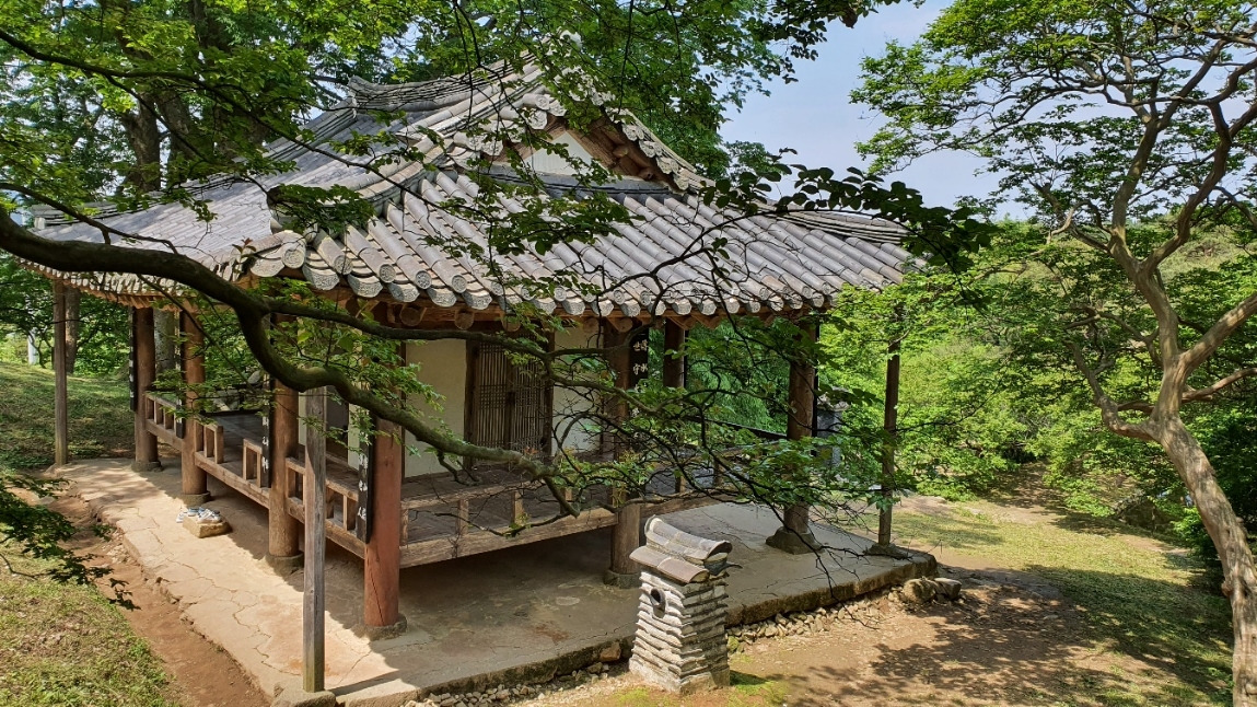 방 안에서 밖을 보는 것은 영화의 스크린을 보는 듯한 효과를 준다. 어두운 방 안으로 들어오는 정원의 모습은 새로운 것이 아닌 방금 지나쳐온 것들이다. 하나의 장면으로 짜 맞춰진 지형과 동선, 그리고 나무와 물은 새로운 경관을 만들었다. 일직선이었다면 겹쳐서 보였을 배롱나무들이 점점 좁아지는 지안 양 옆으로 열 지어있기 때문에 화면의 배경이 된다. 배롱나무의 가지가 물에 비취고 하늘의 구름은 물에 담긴다. 정자에 앉으니 시선이 저절로 아래 있는 물을 향한다. 야트마한 언덕이 주는 시선의 떨굼은 사람을 사색에 빠지게 한다.