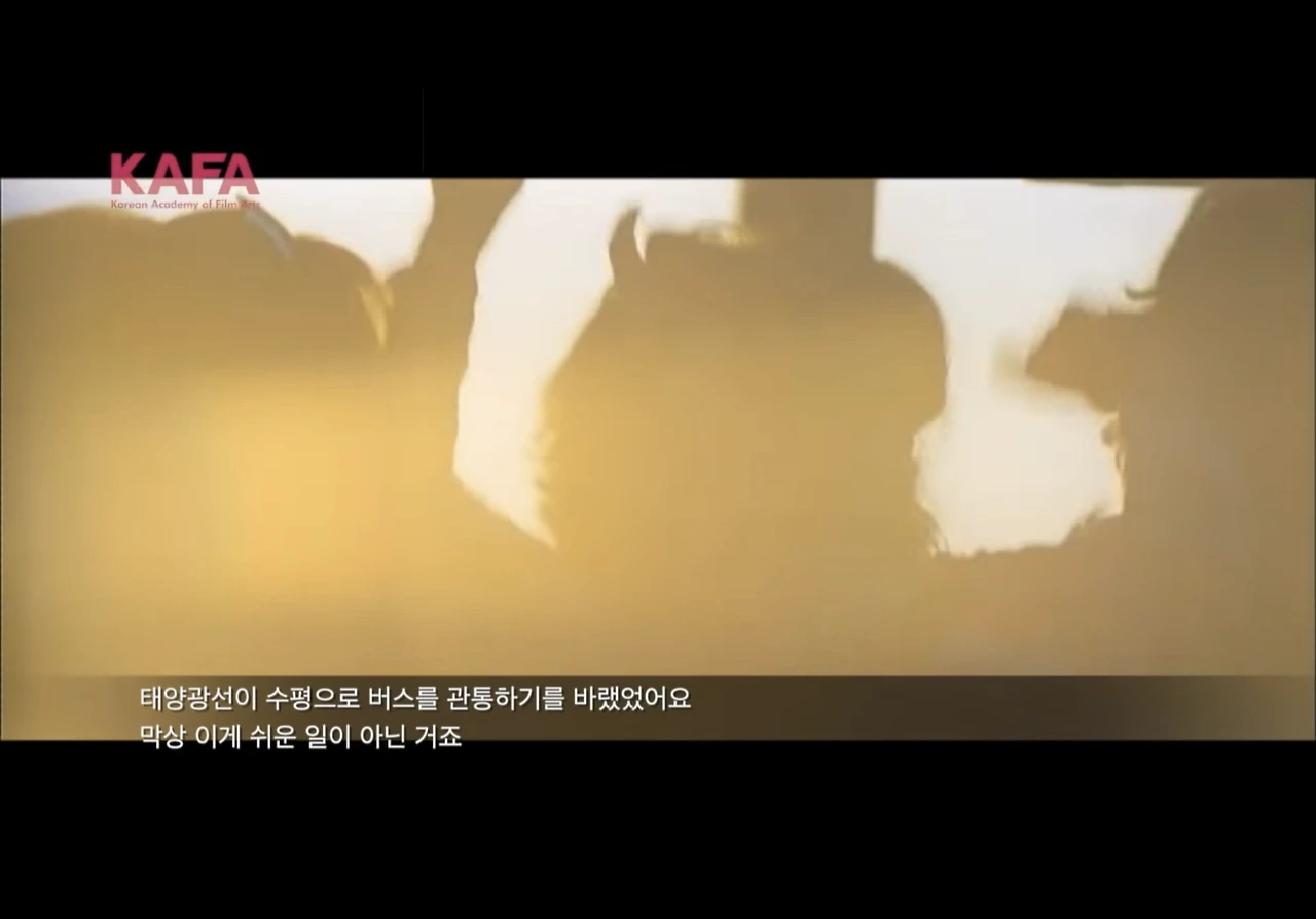 이미 시놉시스에도 등장했던 이 장면을 찍기 위해선 제약 조건이 많았다. 태양이 버스를 수직으로 관통해야 하고 이것을 달리는 차에서 찍어야 했다. 주변에 건물도 사람도 없는 일직선의 도로는 남북방향이어야만 했고 모든 조건을 충족하는 곳을 인천공항 근처 도로에서 찾았다. 태양과 고속버스 그리고 카메라가 모두 일직선인 기회는 하루에 2번뿐, 아침과 해질 때 30분씩이며 계절에 따른 태양의 각도를 계산한 결과 1월 7일이 나왔다.