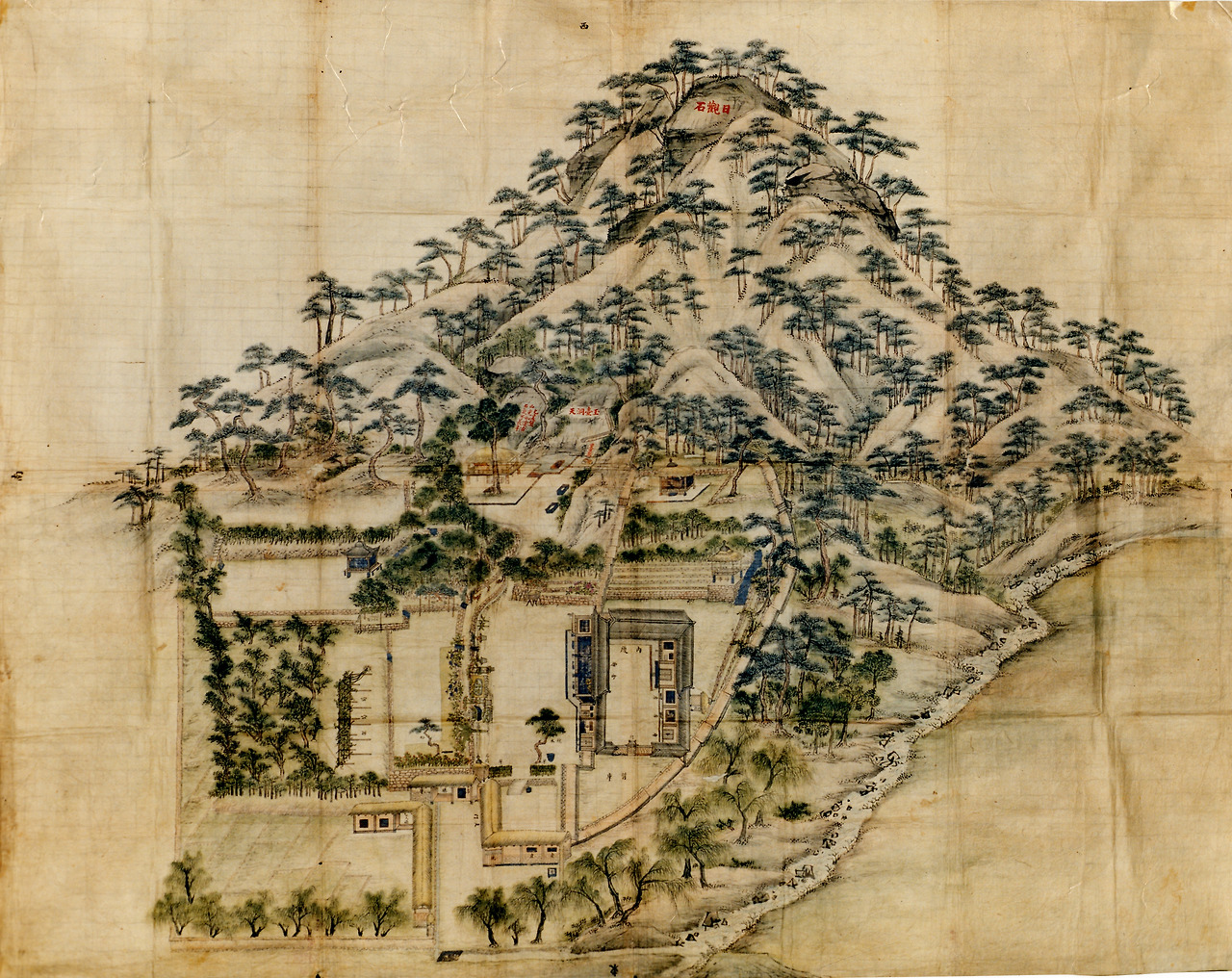 옥호정도의 절반을 가득 채운 산은 백련봉白蓮峯이다. 꼭대기에 적힌 일관석日觀石이라는 각자를 통해 일출을 감상했던 곳임을 알 수 있다. 그림의 절반을 차지할 만큼 백련봉은 정원의 중요한 요소이다. 그림의 중심에는 이 봉우리에서부터 흘러내려오는 물로 만든 지당과 샘을 두었다. 단풍나무 숲으로 둘러싸인 지당과 샘은 김조순의 호, 풍고楓皐를 상징한다. 단풍나무 풍楓과 언덕 혹은 못 고皐자인 풍고를 그림의 중앙에 배치하고 전체 정원의 핵심으로 구성한 것은 자기 자신을 정원으로 표현하고자 했던 김조순의 의도이다.