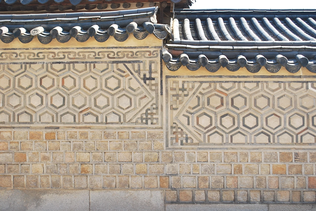담장 장식은 건축의 배경이자 때로는 오브제 역할을 하기도 한다. 낙선재 오른편 담장은 두 가지 역할 모두를 훌륭히 수행한다. 조선 후기에 전돌 생산기술이 발전했다고 하는데, 많이 생산할 수 있게 된 것뿐 아니라 색감에도 신경 쓸 수 있게 된 듯하다. 둔탁한 검은색이 아닌 음영이 다양한 회색과 주황빛이 섞인 전돌로 육각형을 만들었다. 거북이 등껍질 같아 귀갑문양이라 불리지만 이름이 마음에 들지 않는다. 내 눈에는 빛나는 보석 같다. 중간중간에 배치된 흰색과 주황빛의 전돌은 마치 다이아몬드가 반짝이는 듯이 보인다. 4줄의 육각형을 모아둔 기다란 직사각형의 프레임도 예쁘다. 담장 장식의 테두리를 담당하는 시작도 끝도 없다는 뜻의 무시무종 문양은 보통 직각의 형태로 이어지는데 육각형의 장식을 도드라지게 하기 위해서 곡선으로 굴렸다. 모서리의 마무리도 눈에 띈다. 마치 자수를 둔 것 같기도 하고 매듭 같기도 한 귀퉁이는 아래쪽 사선을 짧게 해서 일부러 비율이 맞지 않게 했다. 만약 직각으로 사선을 만들었다면 균형은 맞더라도 뾰족한 느낌을 주고 안정감이 덜했을 것 같다.