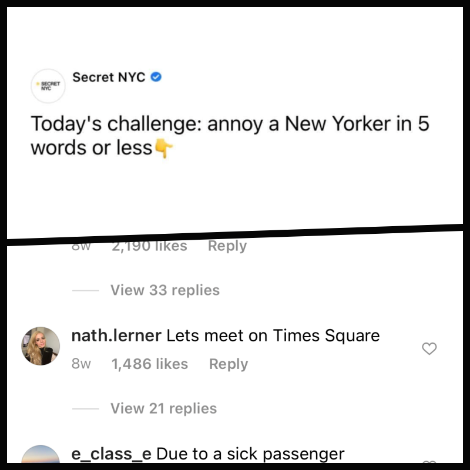 여러분도 잘 아시다시피 타임스퀘어는 뉴욕의 중심지죠. 분위기로 따지면 서울의 명동같은 곳이라고 할 수 있는데요. 브로드웨이 공연들을 보기 위해서는 꼭 와야하는 필수 코스지만 뉴욕 주민 입장에서는 수많은 인파, 호객행위와 지저분한 길거리, 맛집도 없는 정신없는 거리란 점에서 보통은 피하고 싶어하는 곳입니다. 인스타그램의 뉴욕 소개 계정인 @secret_nyc 에서는 "뉴요커를 짜증나게 하는 한 마디" 중 하나로 "타임스퀘어에서 만나자" 가 뽑히기도 했습니다.