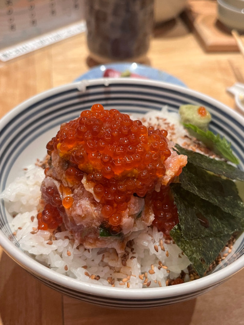 식사 전에는 츠마미(한국서 소위 말하는 스끼다시, 자릿세용 안주라고 보면 될까.)로 참깨된장소스를 올린 참다랑어를 준다. 간장에 찍어먹는 것과는 또다른 회의 깉은 맛이 식욕을 돋운다. 두 점은 날것으로 먹고 나머지는 나중에 국물을 추가해 먹을때 샤브샤브로 살짝 익혀 먹는 것이 꽤나 인기있는 먹는 방법이다. 드디어 나온 도쿠조. 소복히 담긴 밥 위에 다진 회를 올리고, 그 위에 성게알과 연어알을 후룩- 뿌려냈다. 알록달록함이 가히 아름답다.