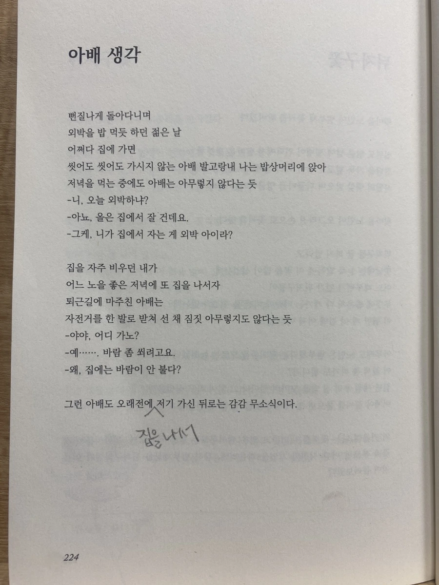 안상학 시인의 아버지가 마음에 많이 남는다. 재밌고 유쾌한 아버지가 시에 고스란히 담겨있다. 안상학 시인의 말에 의하면 아버지가 마을의 분위기를 주도하시는 인물이셨기에 다 같이 놀러 가는 일이 있을 때 아버지가 안 가시면 무슨 재미로 가냐며 여행자체가 취소되었었다고 하셨다.