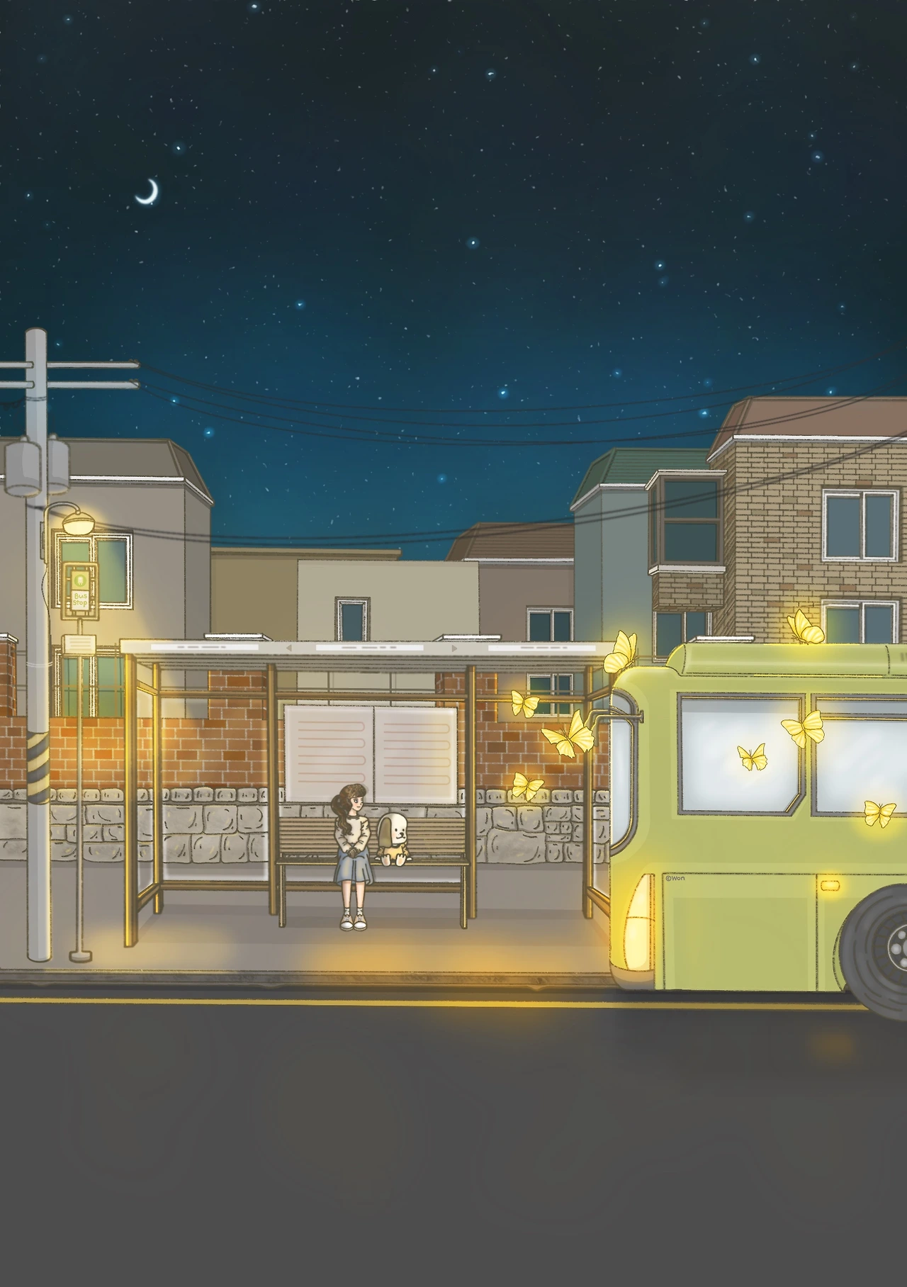 어두운 밤 둘이 함께 버스 정류장에 앉아 버스를 기다립니다빛나고 아름다운 나비와 함께 오는 버스를 타고따뜻한 봄으로 여행을 갑니다