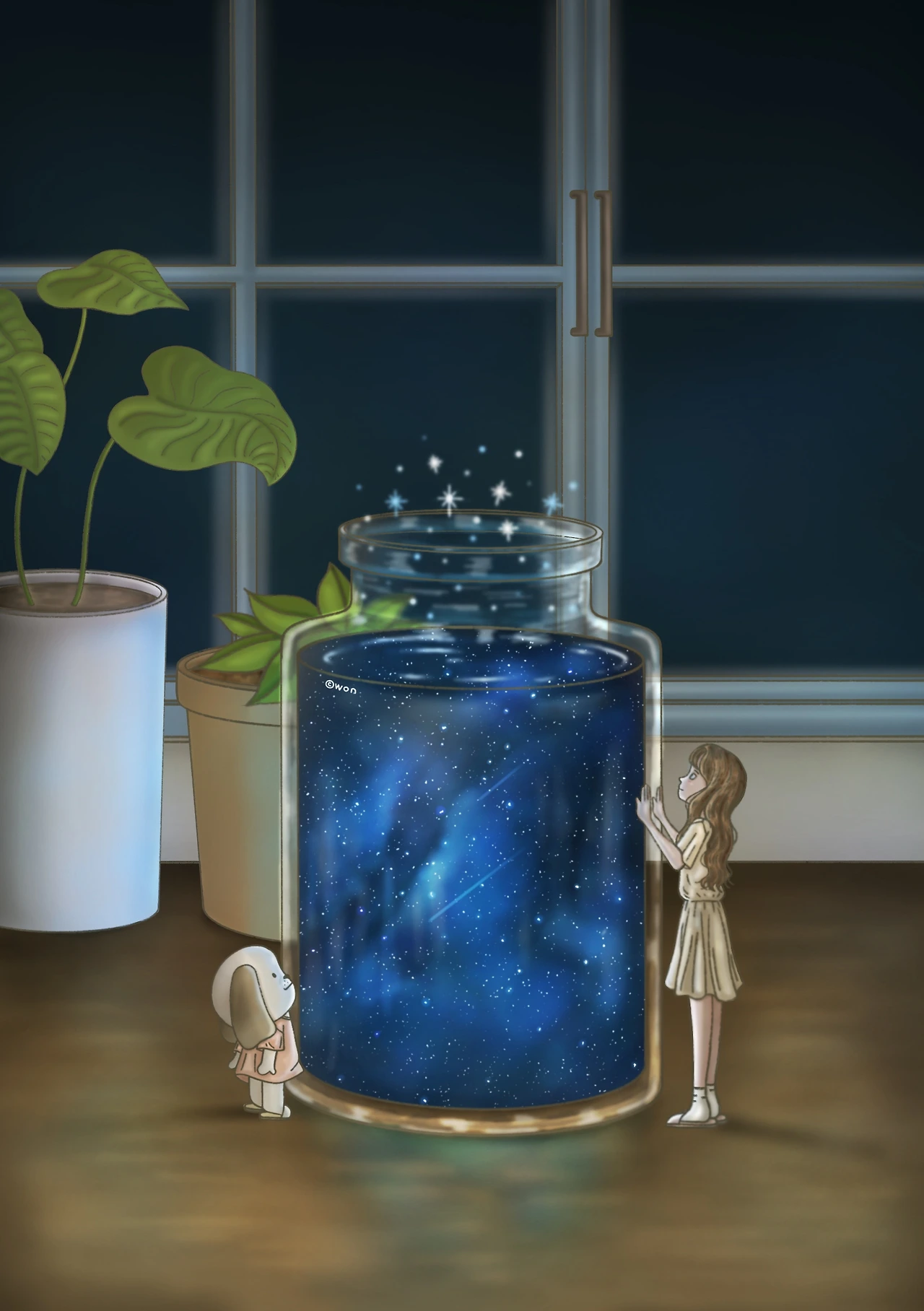 투명한 유리병 속에 담긴 아름답게 빛나는 은하수와 별들이 이 어두운 공간을 밝게 비춰줍니다