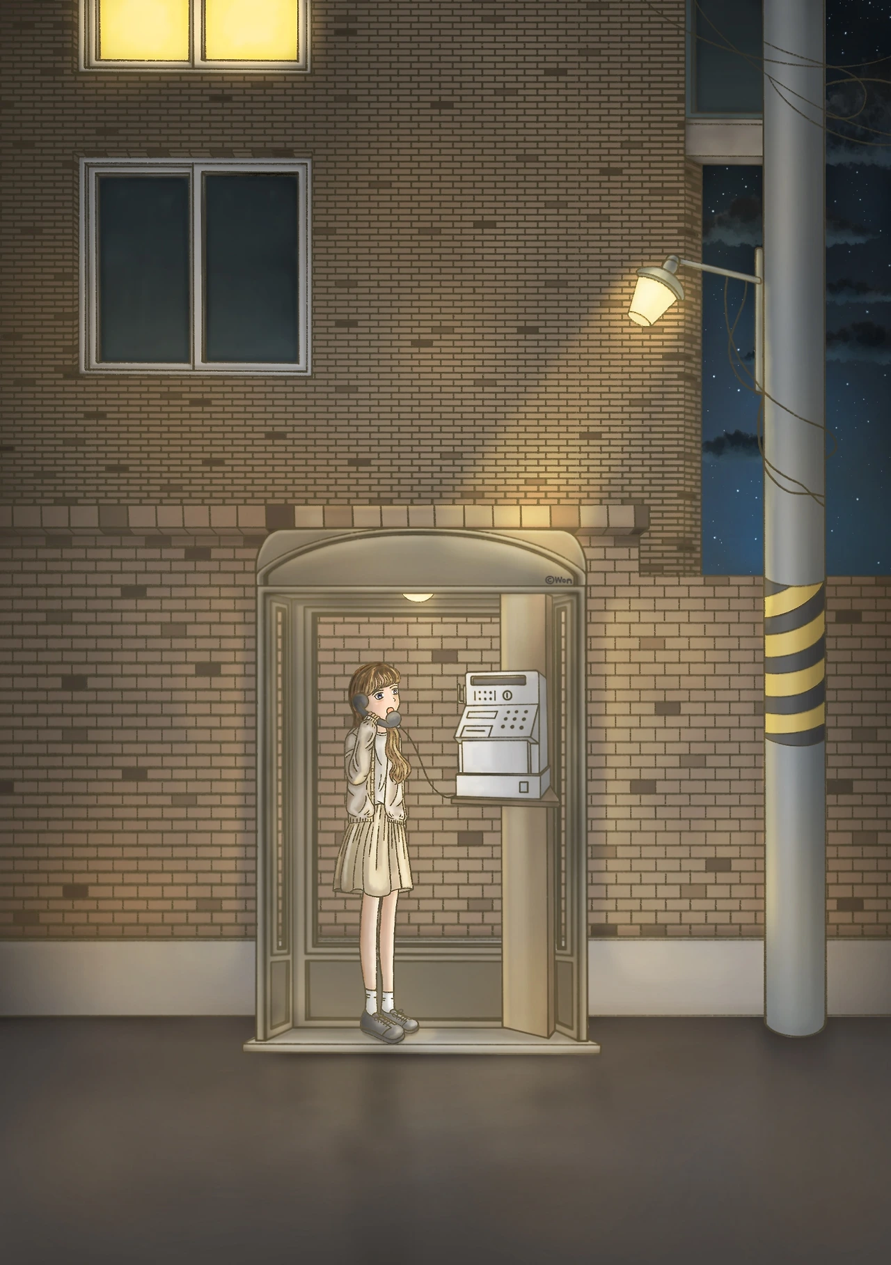 어두운 밤 가로등 불빛 아래 놓인 작은 공중전화부스 안에서수화기 너머로