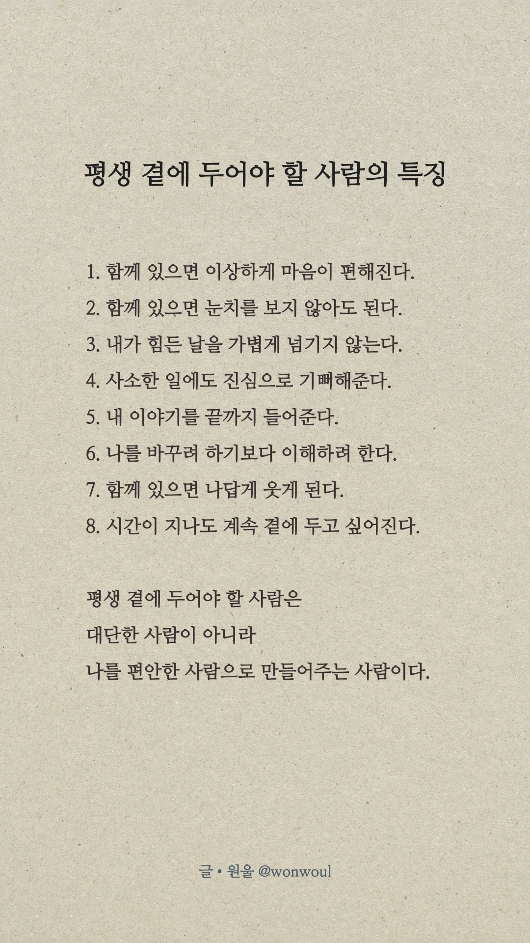 그래서 평생 곁에 두어야 할 사람은 대단한 사람이 아니라 나를 편안한 사람으로 만들어주는 사람이다. 함께 있을 때 괜히 마음이 놓이고, 시간이 지나도 계속 곁에 두고 싶어지는 사람. 세상이 아무리 복잡하고 관계가 어렵게 느껴지는 날에도, 그런 사람 하나 곁에 있다면 우리는 다시 괜찮아질 수 있다. 사람은 결국 자신을 편안하게 만들어주는 사람을 오래 사랑하게 되기 때문이다.