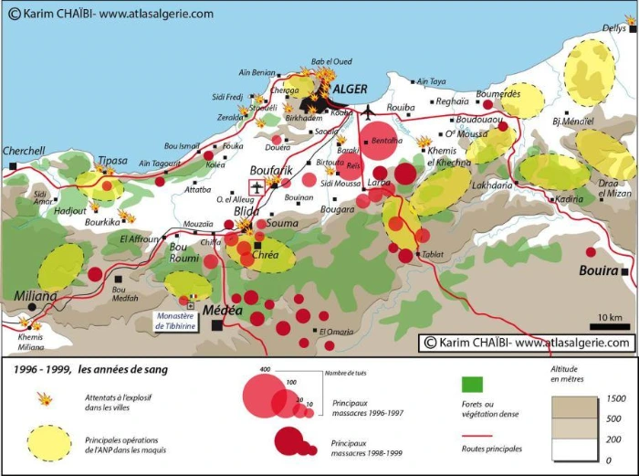 알제리 내전동안 많은 학살이 있었는데, 그중 ‘벤탈라학살’은 마을주민 400여명이 무자비하게 희생당한 역사상 최악의 테러 중 하나로 기억된다. 학살자들은 1997년 9월 22일 밤 11시 30분부터 다음날 새벽 5시까지 변두리 마을 벤탈라의 가가호호를 돌며 말로 다 형언 할 수 없을 정도로 참혹하게 남녀노소 가리지 않고 약탈, 강간, 살해했다. 사건 직후 보도에 따르면 벤탈라 학살의 주범은 휴전을 반대하는 과격단체인 GIA(Armed Islamic Group of Algeria 알제리 이슬람 무장그룹) 대원들인 것으로 알려졌다. 하지만 그날 밤, 가까운 곳에 군부대가 있었음에도 아무도 출동하지 않았다는 사실 때문에 학살의 진실에 대한 의혹이 제기되기도 한다. 더구나 최근 유럽 언론에 의해 내전기간 동안 반군의 폭력성을 강조하기 위해 군부와 유럽의 정보조직이 학살을 은밀히 지원한 경우가 있었다는 증언이 보도된 바도 있다. 다소 선정적이라 할 이 기사들은 진실을 밝히려는 순수한 마음도 있겠지만 그보다는 과거사 논란을 통해 알제리의 내정에 관여를 이어가려는 유럽인들의 욕망을 담고 있기도 하다.