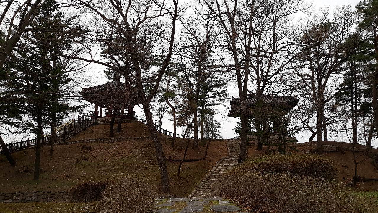 반구정에는 솟아 오른 바위 위에 두 개의 정자가 있다. 앙지정(좌)과 반구정(우). 앙지정이 있는 자리가 원래 반구정이 있던 자리였다고 하니, 지금의 반구정은 정자가 없던 자리에 하나를 더 지은 것일 게다. 두 개의 정자를 올릴 수 있는 자리이긴 하나 무리수였지 싶다. 원래 반구정에서 보였을 270도로 확 터진 임진강의 전망을 옆에 있는 정자가 서로 가리게 되어버렸으니까 말이다.
