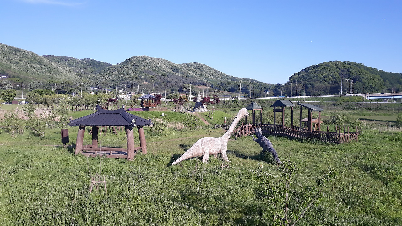 화석정 아래에는 제법 큰 마을이 있다. 화석정이 있어서 그런지 재미있는 모양의 카페나 식당이 있지만 종착지가 코 앞이므로 들어갈 생각은 들지 않았다. 그리고 마을을 벗어나면 멀리 율곡생태습지공원이 보이기 시작한다. 율곡공원인지, 생태공원인지 정체가 모호한 넓은 공원. 공룡, 하트, 다비드 상과 자유의 여신상 등등 둘 데 없는 조형물들을 맥락없이 드문드문 갖다 놓았다. 새로운 경기도 관광공사 사장님의 많은 관심이 필요해 보이는 곳.