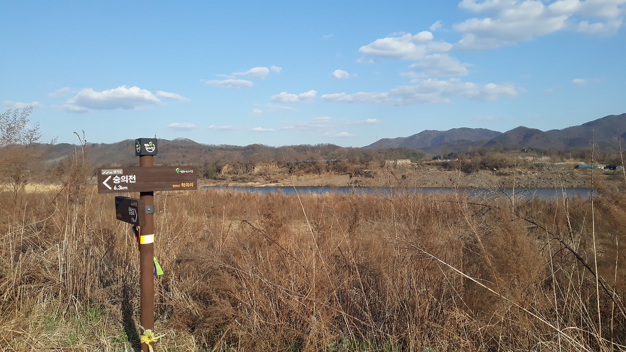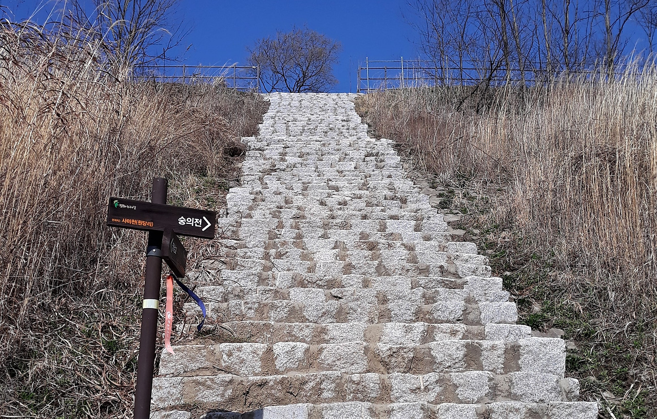 계단 앞 이정표에 주의. 올라가라는 표시가 아니고 오른쪽 천변길로 가라는 표시다. 게단을 오르면 한 시간을 돌아가야 한다.