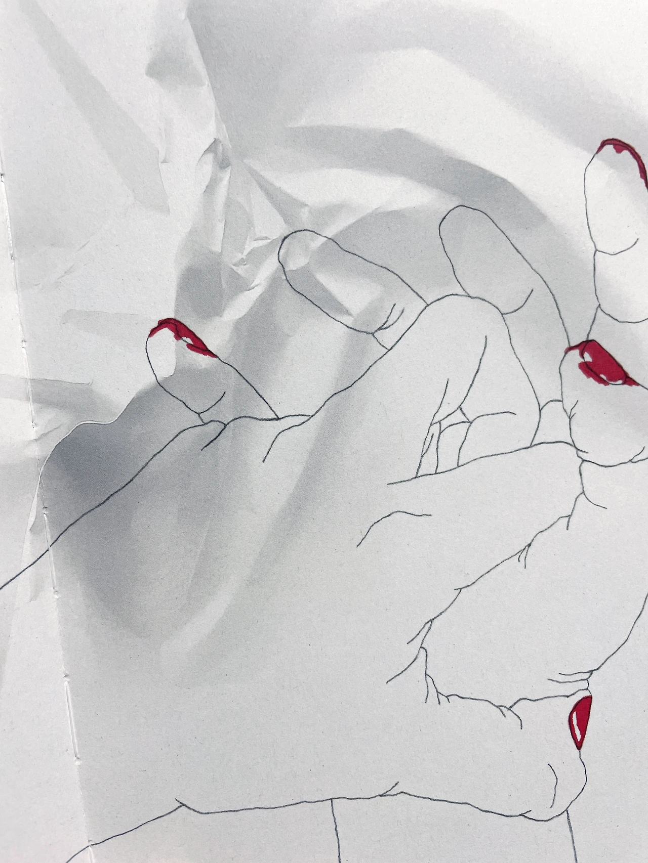 그러던 어느 날, 빨간 매니큐어가 등장한다. 오른손은 정말이지 설레는 마음으로 예뻐질 자신의 손을 기대하며 왼손에 정성스럽고 깔끔하게 매니큐어를 발라준다. 자, 이제는 왼손의 차례다. 왼손이 긴장한 듯 바들바들 떨며 매니큐어를 오른손에게 바르기 시작한다. 오른손처럼 잘 발라줘야 하는데.. 긴장되는 순간이다. 결과는? 다들 경험해 봤겠지만, 엉망진창이다. 빨간 매니큐어 칠이 손톱 밖으로 모두 삐져 나가고 뭉쳐버렸다.