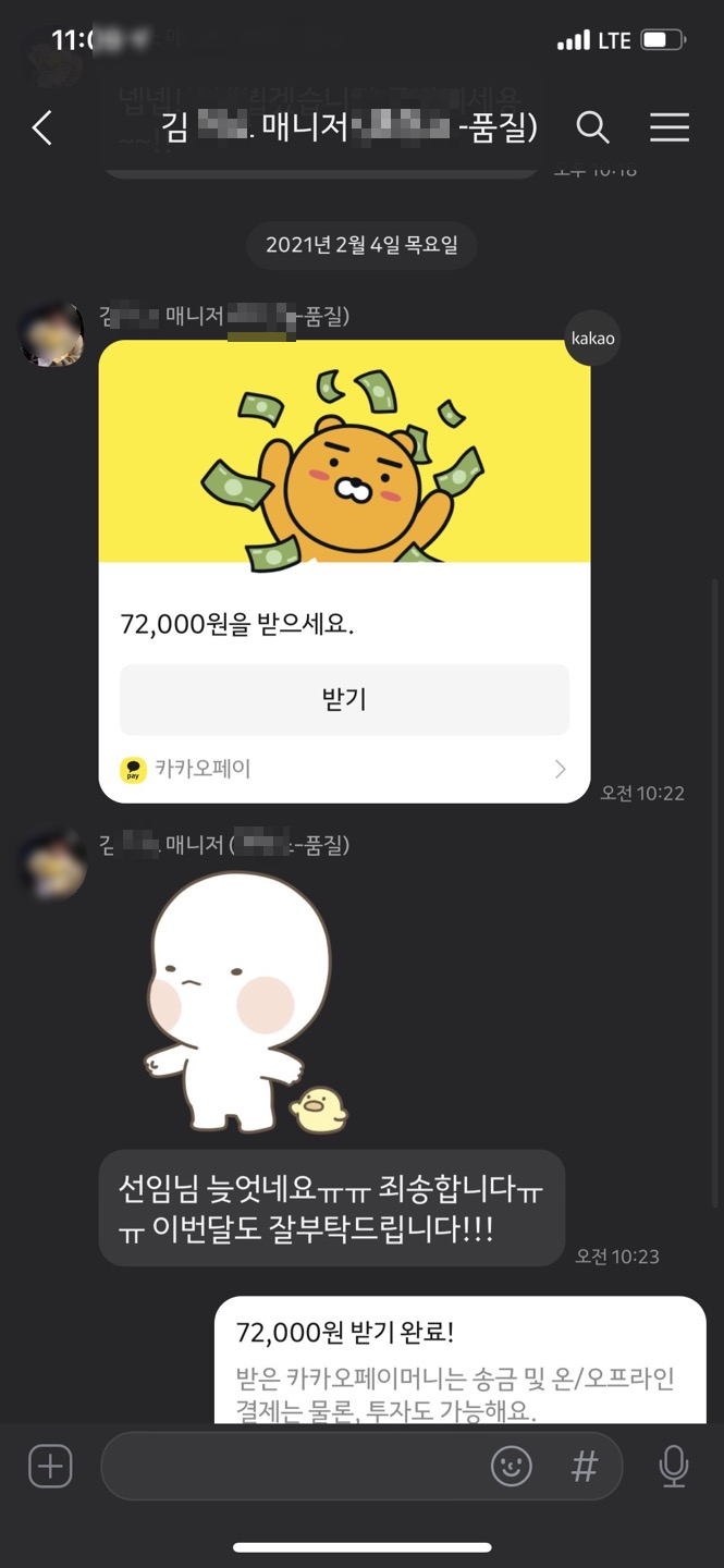그러던 어느 날, 남편이 회사에 청구한 전 달 출장 경비 지급과 관련해 남편에게 정산일을 묻던 중 남편으로부터 뜻밖의 카톡 대화 화면 캡처를 받게 된다. 내가 애당초에 묻지도 않았고, 들어오는지 마는지 관심조차 없던 카풀 비에 대해 남편은 '자신이 늦은 게 아니라 상대의 카풀 비 지급이 늦었음'을 알려 주기 위해 굳이 상대방의 송금 SNS 알림 화면까지 캡처해서 보내 준 것.