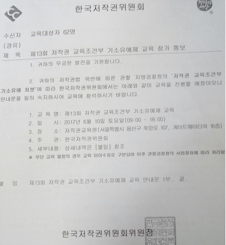 저 말도 어렵죠? 고소하더라도 수사단계에서 검사가 판단할 때 초범이거나 피해가 경미하거나 또는 영리 목적으로 이용한 것이 아닐 경우에는 저작권 교육(저작권 위원회에서 1일간 8시간)을 받는 조건으로 기소유예 처분을 내릴 수 있습니다. 말 그대로 기소를 유예하는 것이죠. 단, 교육을 이수하지 않으면 검사가 기소할 수 있습니다.