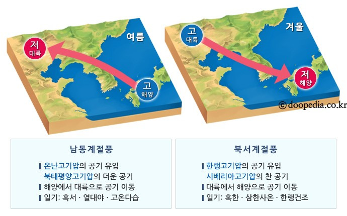 뭐, 사실 한국은 대만, 발리, 하와이에 비해서는 서핑하기 불리한 환경이지만 나름 감질나는 파도가 있습니다. 그 감질나는 한국 파도 특성으로 아마 한국 서퍼들이 그렇게 "악바리"인지도 모르겠습니다. 우리나라는 3면이 바다이고 동해랑 남해는 수심도 깊고 모래 해변도 많습니다. 특히 계절에 따른 바람인 계절풍의 영향을 강하게 받습니다. 대기의 대순환으로 인한 무역풍, 편서풍과 달리 우리나라는 편서풍 영향 지역임에도 대양과 대륙 사이에 끼어있어서 실제로는 계절풍의 영향이 큽니다. 즉, 여름에는 남동풍, 겨울에는 북서풍, 북동풍이 부는 것이죠. 본의 아니게 또 어려운 용어를 남발하네요.