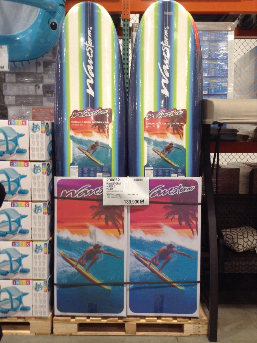 초반부터 자신의 보드를 구매하고 싶다면 스폰지 보드를 구매하는 것을 추천해요. 스폰지 보드는 이마트와 코스트코에서도 구매할 수 있습니다. 이마트 보드는 일반적인 롱보드 길이인 9피트 정도인데, 코코보드는 8피트이어서 이마트 보드가 타기 수월합니다. 대체로 길이가 길면 파도를 잘 잡을 수 있고, 안정적인 라이딩도 할 수 거든요. 다만, 물건이 늘 있는 것이 아니라서 발품을 팔으셔야 해요. 물건이 들어오면 금방 동이 난다고 합니다. 가격대는 대충 10만원 중반(코스트코)부터 20만원 초반(이마트)정도.