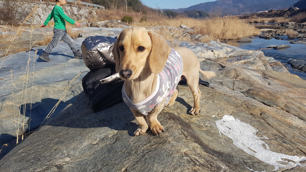 햇살이 좋아서 조깅을 가려고 나섰다. 아이들을 대신봐주기로 한 조카가 후니를 데리고 가라고 했다. 흔쾌히 핑크색에 흰 점이 박힌 잠옷 셔츠를 입혔다. 우리는 한참 사이좋게 달렸다. 다리 위에서 트럭이 오는데도 아무렇지도 않게 길 한복판으로 달리는 것을 길가로 끌어올리면서 '말 안 듣네'생각했지만, 촌이라 차가 없으니 괜찮았다.