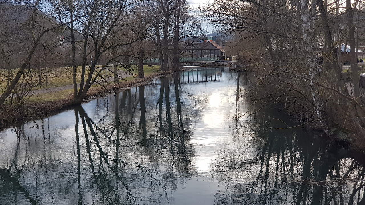 시내 도로를 건너고, 옛 물레방아 건물 옆에서 강을 굽어보았다. 물결이 햇빛을 반사한다.