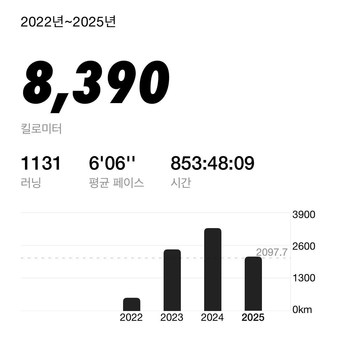그동안에 풀 마라톤 완주가 5번, 달린 거리 누적 8390km이다. 시간으로 환산하니 853시간 48초.