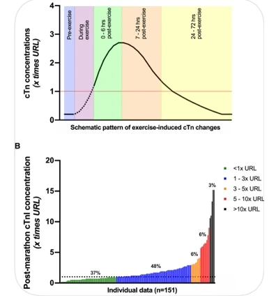 심근 경색과 같은 심장 근육의 손상 시 지표로 활용되는 심장효소(Troponin, CK-MB) 수치도 마라톤 직 후 24시간 까지 증가한다. 이는 심근경색과 같은 병적인 상태를 의미하는 것은 아니다. 지속되는 심장의 운동으로 인해 일시적 세포막 투과성의 증가로 인한 것이라 설명되는데, 중요한 것은 그만큼 심장도 부하가 가해졌다는 것이고 적절한 휴식은 반드시 필요하다는 것이다.