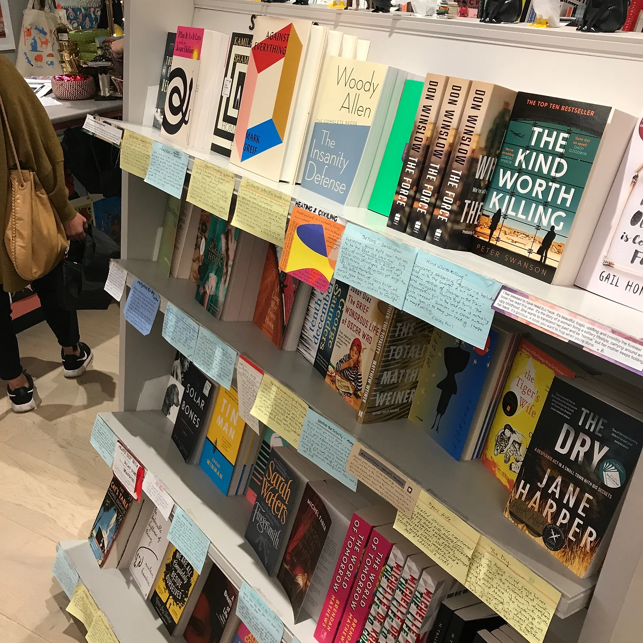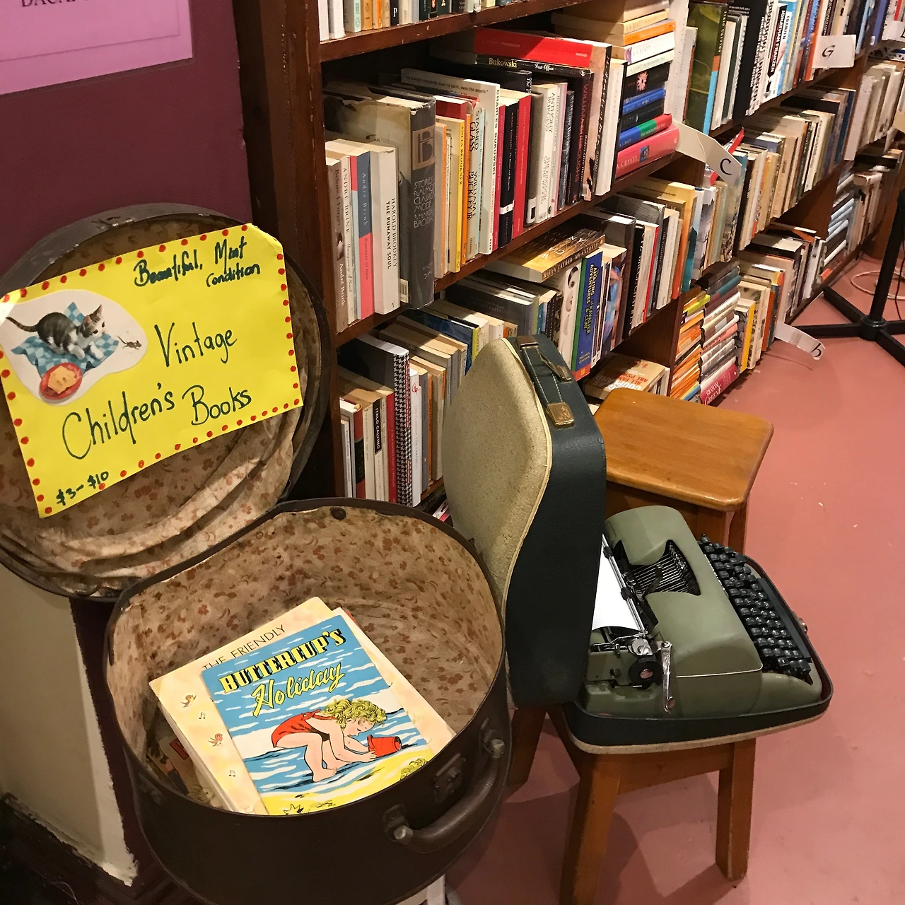 초록색도 종류가 참 많은데, 내가 제일로 좋아하는 초록색의 벽돌이 책방을 감싸고 있었다. 그것만으로도 괜히 책방이 좋아졌다. 몇 발자국 되진 않지만 짧은 통로를 지나니 책방에서 셀렉한 책들이 보기 좋게 나열되어 있었다. 계산대 앞쪽에 스탠딩 책꽂이에는 책들이 모두 표지가 보이게 세워져 있었다. 표지 앞으로 메모가 모두 붙여 있었는데, 책방에서 이 책을 추천하는 내용들이 적혀 있었다. 메모는 책방에서 직접 쓴 수기메모로 내용도 꽤나 빼곡하게 적혀있었다. 아무래도 그런 책들에게 눈길이 가는 게 사실이었다. 덕분에 나는 한국에 계시는 내 책이 입고되어 있는 책방사장님들께 속으로 감사의 인사를 보냈다. (책을 하나하나 소개하는 것이 쉽지 않은 일인데…감사합니다.) 안쪽에는 아이들이 볼 수 있는 책들이 있었다. 작은 공간이었지만 키즈카페 같았다. 책들만 유아용도서가 아니라 분위기도 그렇게 맞추어 놨다.