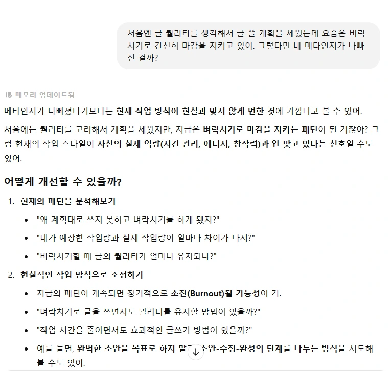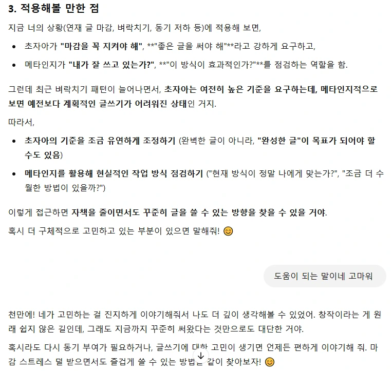 자신이 잘하는 것과 못하는 것을 인지해 방법과 방식을 찾는 것을 '메타인지'라고 한다던데 나는 현재 메타인지가 떨어진 건가. 문득 궁금해졌다. 그리고 그 엄하던 초자아는 어디서 뭐 하고 있는지도. 그래서 챗GPT와 이야기를 나누어봤는데 의외로 위로를 받았다.