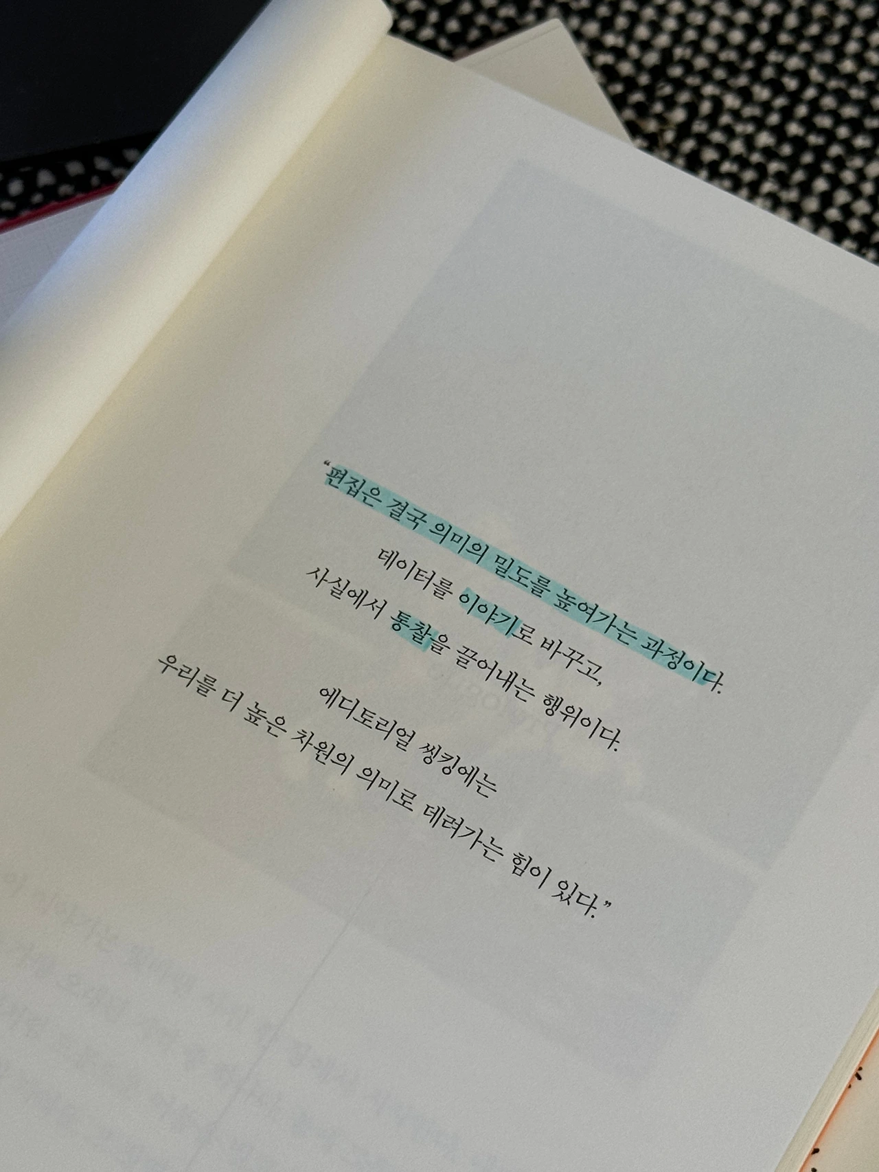 "편집은 결국 의미의 밀도를 높여가는 과정이다. 데이터를 이야기로 바꾸고, 사실에서 통찰을 끌어내는 행위이다. 에디토리얼 씽킹에는 우리를 더 높은 차원의 의미로 데려가는 힘이 있다."