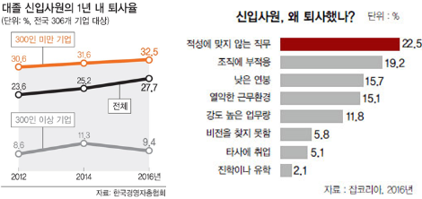 그럼에도 신입사원의 1년 내 퇴사율을 오히려 상승하고 있습니다. 취업을 준비하는 입장에서는 이해하기 어렵겠지만, 대략 3명 중 1명은 1년 안에 회사를 떠나는 셈이죠. 게다가 제일 높은 퇴사 이유가 '적성에 맞지 않는 직무'라고 하니 기업의 인사담당 부서는 '제대로 뽑은 거 맞냐'는 경영층의 질책을 받을만한 상황입니다. (만약에 어떤 회사의 제품이나 서비스가 1/3이 불량이라면, 그 책임 부서는 무사할까요?)