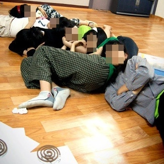 왼쪽은 마을잔치 초대장 만드는 모습, 오른쪽은 낮잠시간. 서로의 몸을 베고 잤다. 힘들 때도 벽에 기대는 대신 서로 등을 맞대고 기대고 있었다. 그게 농활의 규칙이었다. 너무 귀여운 얼굴들이지만 본인들은 원치 않을 수 있을 것 같아 모자이크를..