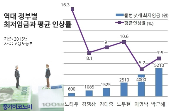 7.3%는 굉장히 높은 인상률이다. 이명박 정부보다 박근혜 정부 들어 최저임금이 많이 올랐다. 이번 정부에서는 (이전 정부와 달리)고용노동부 장관이 최저임금위원회에 심의를 요청할 때 “노동소득분배 사항이 개선될 수 있도록 최저임금을 올려달라”는 문구가 붙었다. 최저임금을 올리겠다는 게 대선공약이었다. 그러나 알다시피 최저임금이 올라서 경제사정이 나아졌는가 하면 아니다.