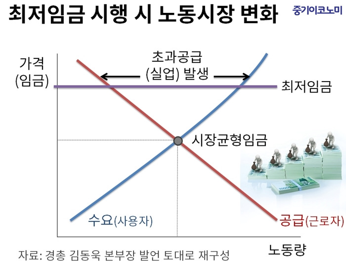 그런데 여기서 문제가 발생한다. 가격을 인위적으로 높게 잡으면 노동시장에서 초과공급이 생긴다. 일할 사람에 비해 일자리가 부족하다는 의미다. 최저임금 근로자가 많은 24시간 편의점에서 알바 3명이 8시간씩 일하고 있다고 가정해 보자. 최저임금이 오르면 점주는 알바 한 명을 해고하고 그 시간에 본인이 일을 하거나 기존 알바의 근무시간을 줄일 것이다. 최저임금을 올리는 게 최저임금 근로자들에게 도움이 되는 일인지 생각해봐야 한다는 것이다.