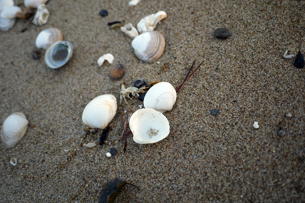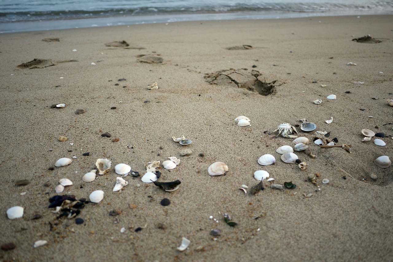 파도에 떠밀려온 조개들. 작은 게도 있다.