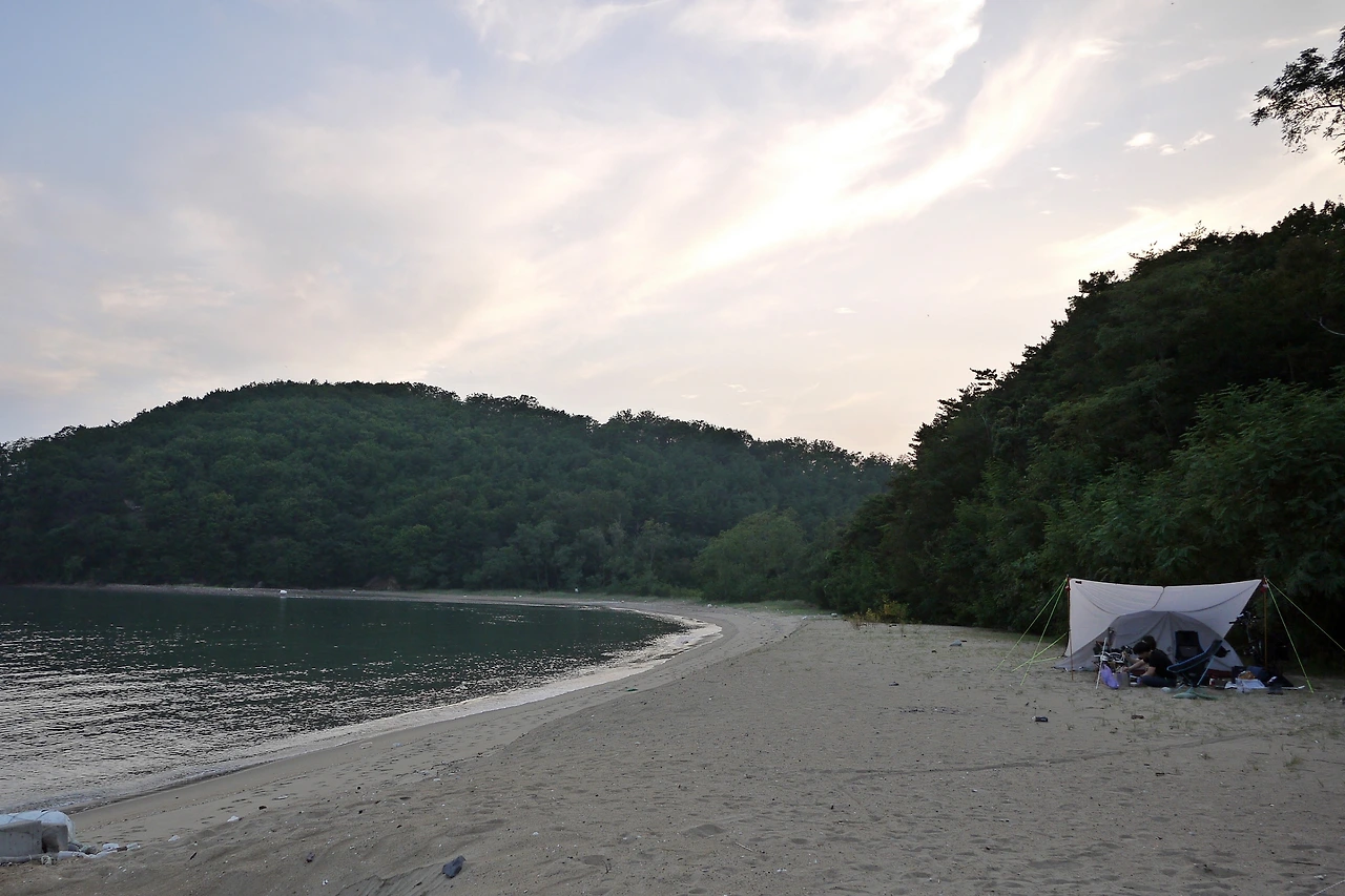 모래사장 위에 텐트를 치고 잠을 잤다. 새벽녘에 물이 다시 밀려들어왔는데, 파도소리가 크게 들려 비가 오는줄 알았다.
