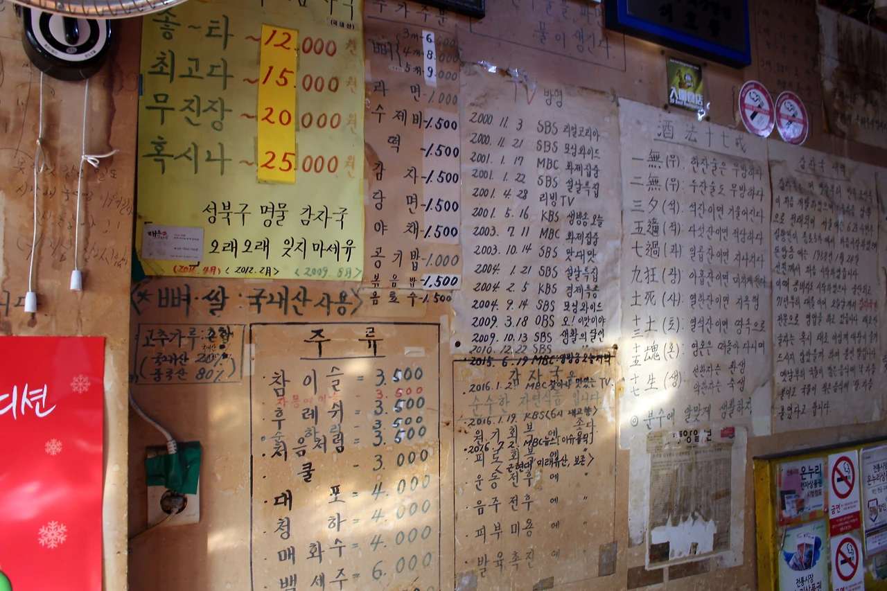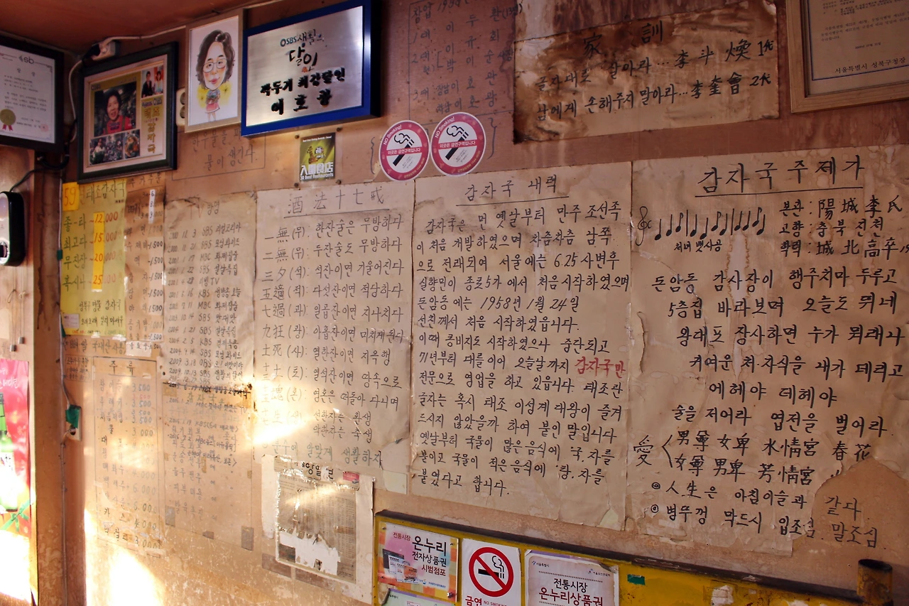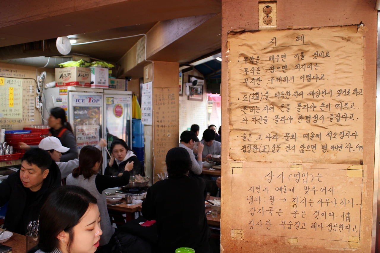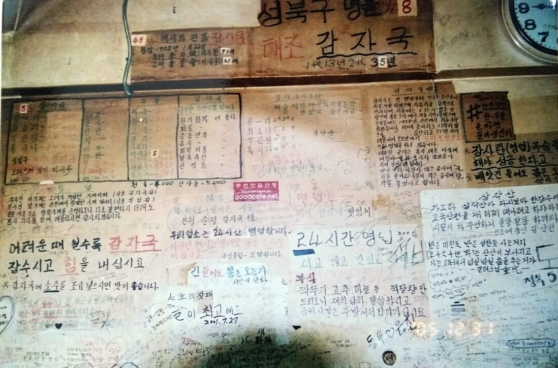돈을 꽤 벌었을 것도 같은데 그렇지는 않단다. 태조감자국은 창업 당시부터 아직까지 셋방살이다. 지금 사업장 맞은편에 가게가 하나 더 있었지만 건물주가 바뀌며 10년 전에 가게를 뺐다. 당시엔 1~3층을 모두 쓸 정도로 규모가 컸지만 많이 줄었다. 매출도 감소했지만 “지금이 더 알차 졌다”는 것이 이 사장 얘기다. 이 사장의 어머니와 동생, 직원 7명이 번갈아가며 일을 하고 있다. 위 사진은 본래 쓰던 가게를 빼기 직전 아쉬운 마음에 찍은 사진이다. 아버지가 직접 적은 글귀들이 가득한데, 종이를 붙인 뒤에 쓴 터라 잘 떼어지지 않았다는 것이다. 애달픈 마음에 "벽을 떼 오고 싶었다"고도 했다. 현재의 가게에 적힌 글귀들은 대부분 이씨의 동생이 옮겨 적은 것이다.