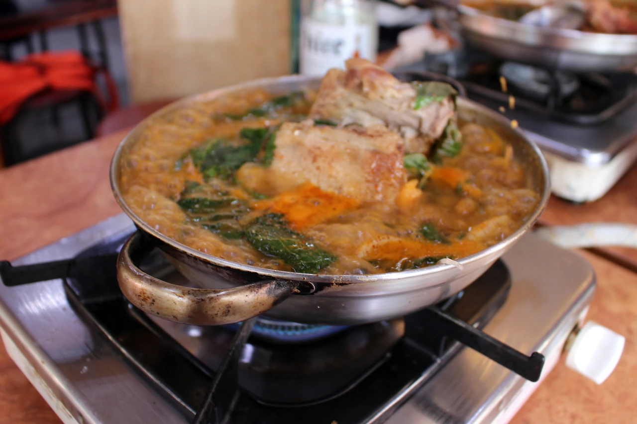 먹어보니 확실히 이 요리는 탕이 아닌 ‘국’이었다. 1인분을 시키니 돌솥용기가 아니라 휴대용가스버너에 냄비가 나왔다. 넉넉한 육수에는 돼지등뼈, 깻잎, 감자, 수제비, 떡, 당면이 듬뿍 담겼다. 아삭아삭한 깍두기와 생양파, 청양고추도 테이블을 수놓는다. 가격은 1인분에 7000원. 2인분부터는 맛깔난 한국어로 음식의 양을 표현했다. ‘좋-타’가 1만2000원, ‘최고다’가 1만5000원, ‘무진장’이 2만원, ‘혹시나’가 2만5000원이다.