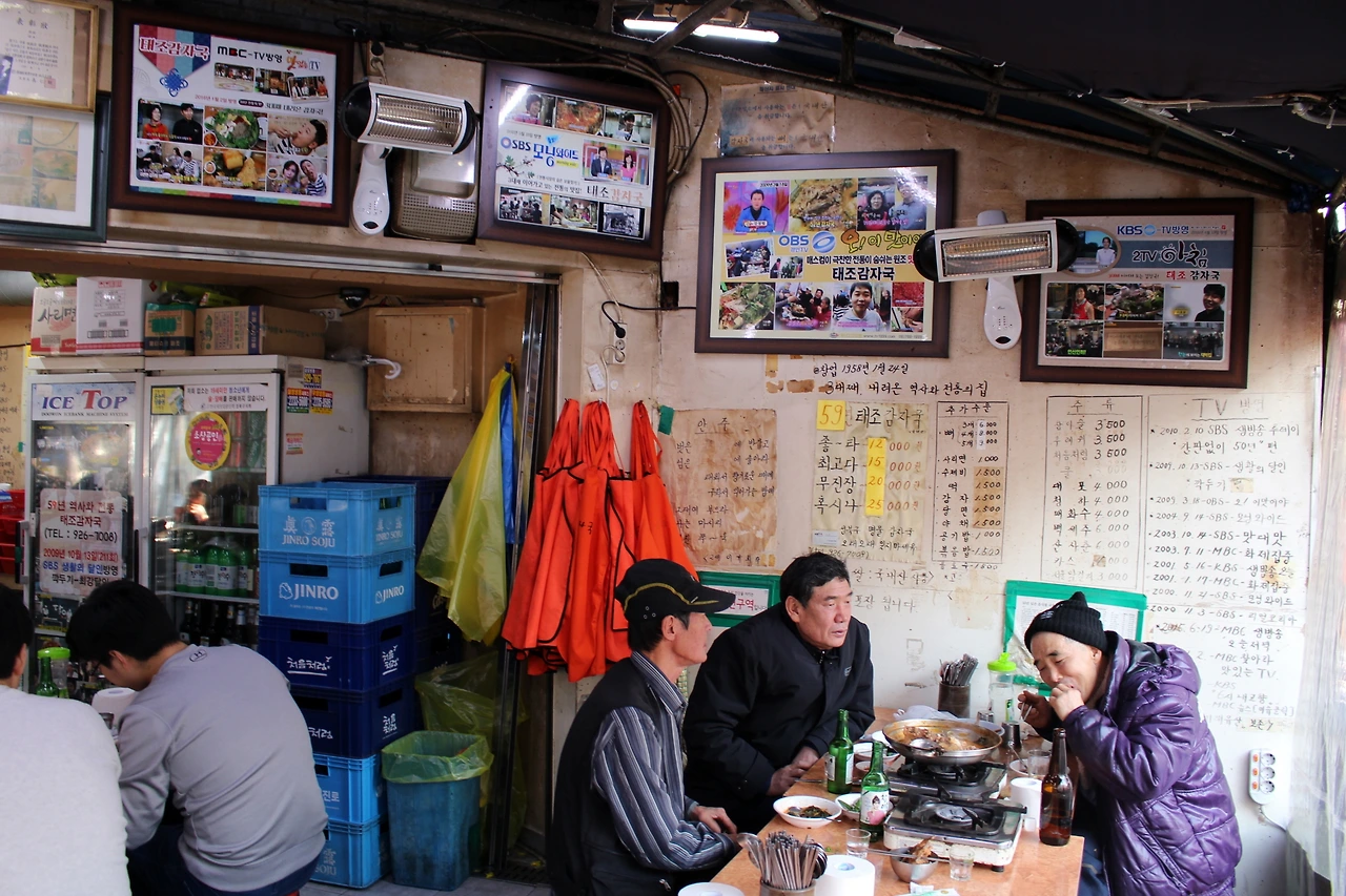 태조감자국엔 아직도 손님이 끊이지 않는다. 점심시간을 지나 비교적 한산할 시간이었는데도 가게엔 빈자리가 없었다. 절반은 감자국에 소주 한잔을 곁들이는 중년들이고, 절반은 늦은 점심을 먹으러 온 청년들이었다. 이 동네 주민도 있고, 입소문을 듣고 멀리서 찾아오는 이들도 있다. 해가 뉘엿뉘엿 넘어가면 줄을 서서 먹어야 할 정도다.