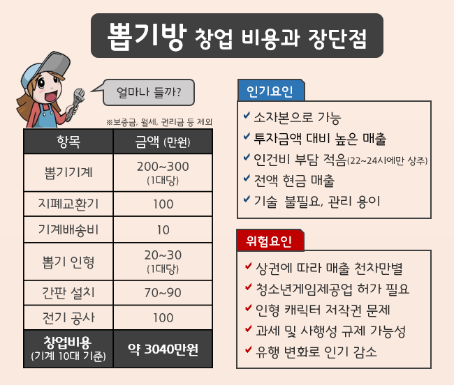 초기 창업 비용도 저렴한 편이다. 인형뽑기 가맹사업을 하고 있는 '인형언니'에 따르면 뽑기 기계는 대당 200~300만원선이다. 점포 한곳당 5대~10대 가량을 설치한다. 뽑기 안에 들어갈 인형들은 기계 한대당 20~30만원가량 든다. 한대당 100만원 안팎인 지폐 교환기도 1~2대 필요하다. 기계배송비는 서울 기준 10만원 안팎, 전기 공사비는 매장 평수에 따라 다르지만 대략 100만원 정도다. 간판 설치 비용은 70~90만원선이다. 권리금, 보증금, 월세 등을 제외한 창업 비용은 약 5300만원(기계 10대 설치 기준)이다.