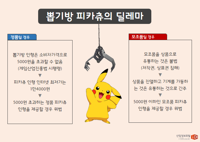 5000원 이하인 모조품 피카츄를 넣으면 된다고 생각할 수도 있는데, 이것 역시 위법이다. 법무법인 유스트 이인환 변호사 에 따르면, 저작권이나 상표권을 침해하는 물품을 영업 목적으로 유통할 경우 형사처벌 대상인 동시에 민사상 손해배상 책임도 있다. 인형뽑기 게임은 가동시키는 그 자체로 물품을 유통하는 것이므로 정품 여부를 확인해야 한다.