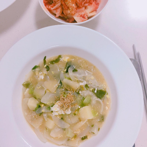 추운 날, 비 오는 날 생각나는 수제비. 쫄깃한 밀가루의 식감에 진한 국물까지 더해지면 환상이다. 감자도 송송 썰어 넣고, 양파와 파도 넣는다. 모든 한국음식이 그렇듯 여기도 다진 마늘을 넣어 국물을 내면 맛있다. 배추김치와 곁들여 먹었다. 다음엔 영화 속 혜원이처럼 빨간 수제비를 끓여봐야지.