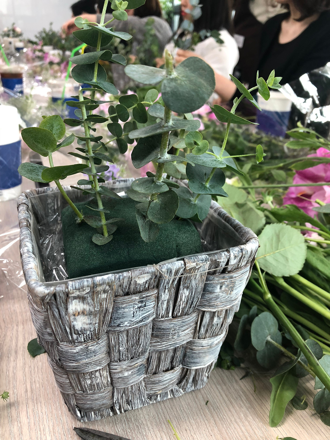 물을 머금고 있는 플로럴폼(속칭 오아이스)에 꽃을 꽂아준다. 먼저 유칼립투스같은 녹색 식물로 자리를 잡아줬다. 가위로 꽃 줄기 부분을 잘라내 길이를 조절한 다음 꽂는다. 생각보다 많은 부분을 잘라내야 한다.