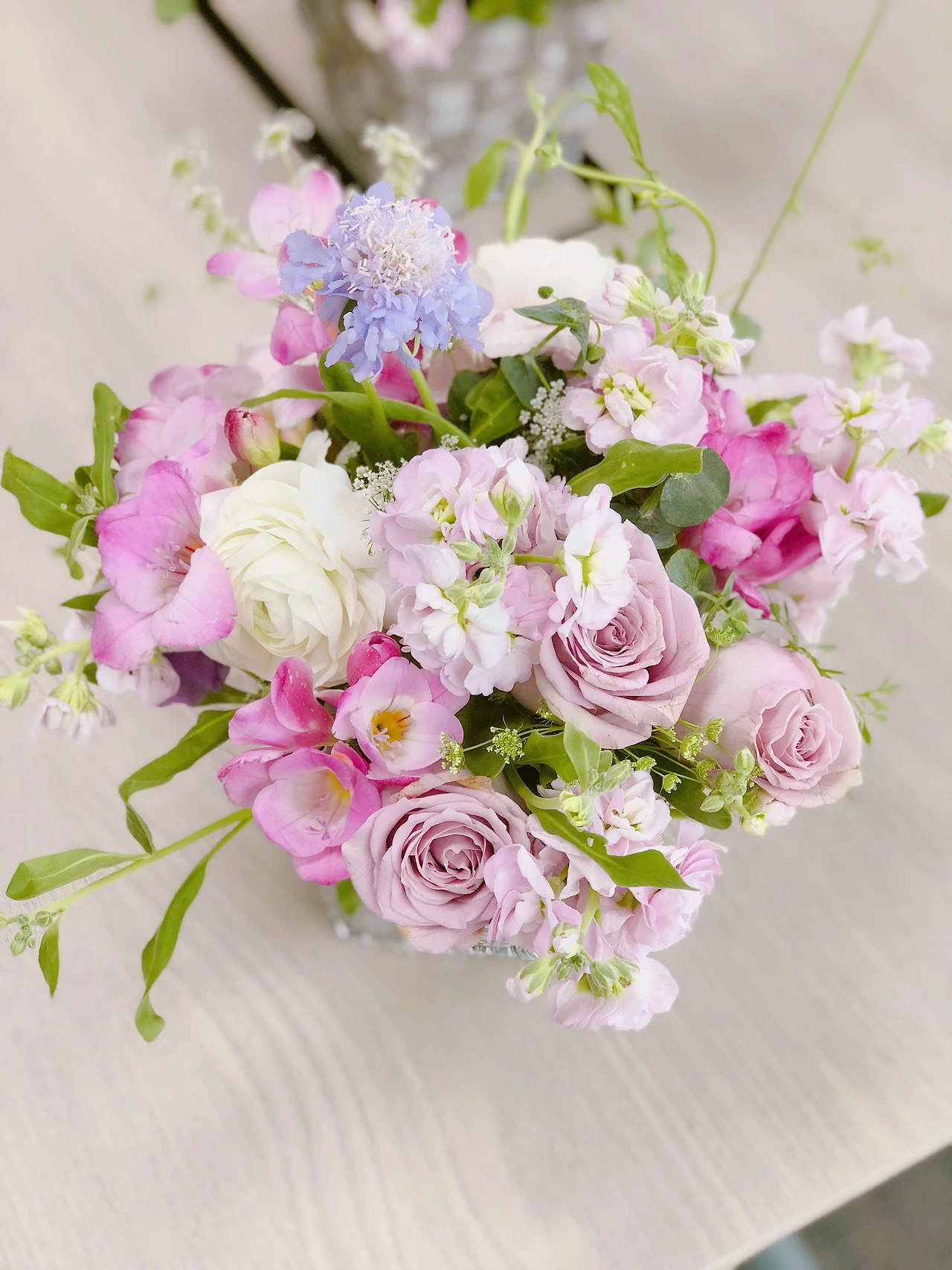 중간 과정은 찍지 못해서.. 완성된 모습이다. 내가 만든 첫 꽃 화분! 화려한 꽃들만 있는 것보단 푸릇푸릇한 아이들을 중간 중간 넣어주니 훨씬 다채워로보인다. 꽃들의 높낮이도 달리해서 리듬감을 준다. 한 송이정도는 높게 빼서 포인트를 주기도 한다. 같은 꽃을 가지고도 제각기 다른 조합을 만들어내는게 흥미롭다.