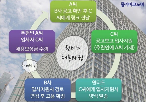 ◇“지인 추천, 회사·구직자 모두 윈윈”=원티드는 기존에 헤드헌터가 하던 일을 누구나 할 수 있게 만들었다고 보면 된다. 지인을 채용 공고에 추천한 사람은 적게는 수십만원에서 많게는 수백만원까지 보상금을 받을 수 있다. 만약 A가 원티드 내 채용공고 링크를 B에게 전달해 B가 입사에 성공하면 두 사람 모두 채용보상금을 받을 수 있는 시스템이다.