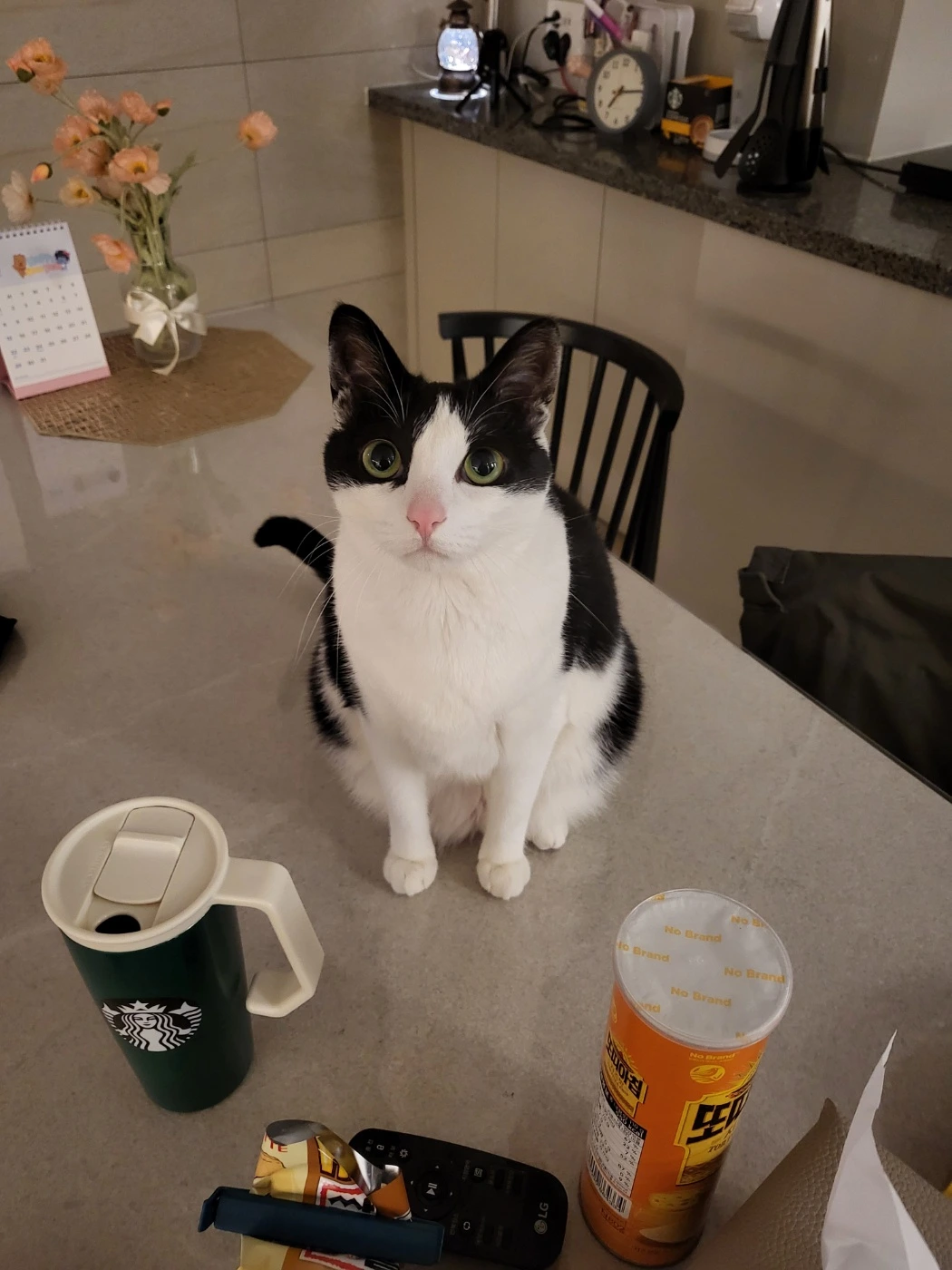 아침에 출근하려고 하면 이렇게 식탁 위에서 장화 신은 고양이 눈을 하고선 간식을 요구한다. 귀여운 녀석.