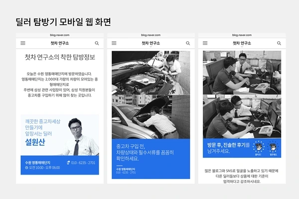 첫차 앱에 접속하면 딜러의 사진과 전화번호, 소개글이 꼼꼼하게 적혀있다. 아무리 담이 센 사람이라도 본인 얼굴을 걸어놓고 버젓이 사기를 치기란 쉽지 않은 일이다. 여기서 차를 파는 사람들은 일단은 믿어도 좋다는 미스터픽의 판단을 받은 이들이다. “직접 딜러들을 만나 어떻게 차를 팔고 있는지 들어봤습니다. 한 사람당 최소 1시간 이상씩 얘길 나눴죠. 그렇게 딜러들을 만난 이야기를 회사 블로그에 탐방기 형태로 게재했고요” 최 대표의 말이다.