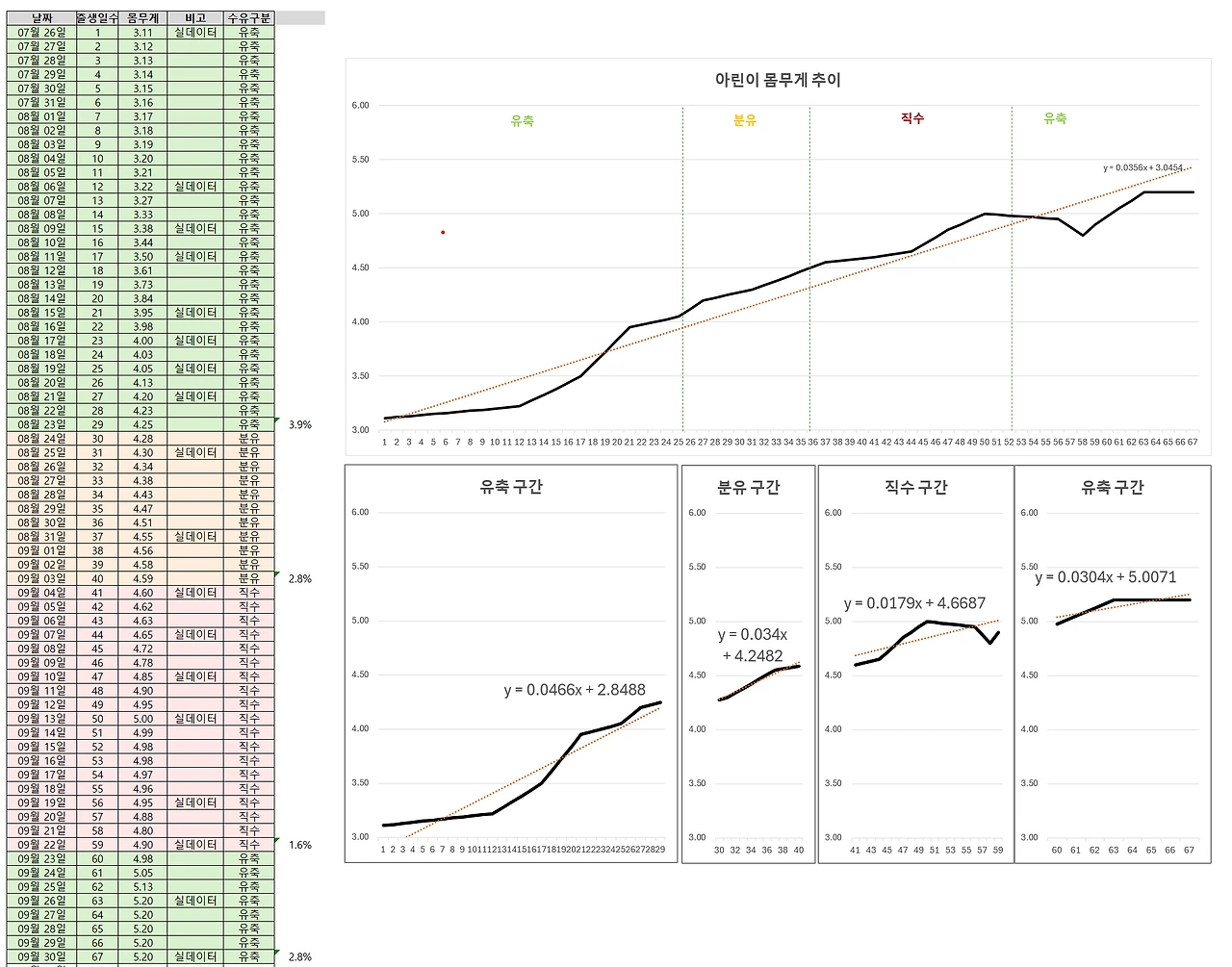 몸무게는 매주 월요일에 측정을 했는데, 젖병 수유(모유, 분유)를 할 때는 꾸준히 늘어가던 몸무게가 직수를 하는 시기에는 잘 늘지 않았다. 심지어 일주일이 지났는데 몸무게가 줄어 있기도 했다. 몸무게가 천천히 느는 것까지는 그렇다 치지만 신생아의 몸무게가 감소한다는 건 너무 충격적인 일이었다. 책도 찾아보고, 진짜 몸무게 증가량이 더딘 것인지 분석도 해보고, 소아과 의사에게도 물어보았다. 의사는 별일 아니라는 듯 "젖양이 부족할 수 있으니 직수를 한 뒤 분유로 보충 수유를 하시라"라고 했다.