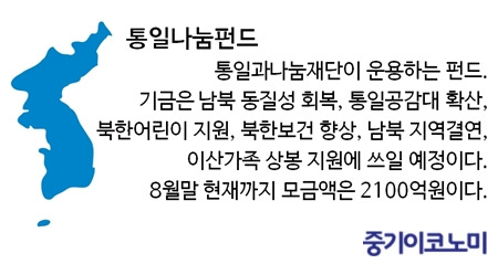 출범한지 두 달이 채 안됐지만 호응은 상당하다. 전병길 통일과나눔재단 사무국장은 지난달 28일 중기이코노미와의 통화에서 “지금까지 약 6만3000명이 통일나눔펀드에 참여했다. 기부금 총액은 약 2100억원으로 이준용 명예회장이 이중 2000억원을 냈다”고 했다. 전 사무국장의 말에 따르면 두 달간 약 6만3000명으로부터 100억원을 모금한 셈이다.