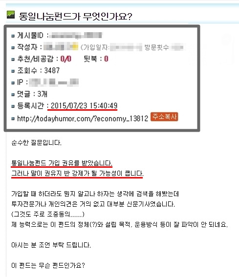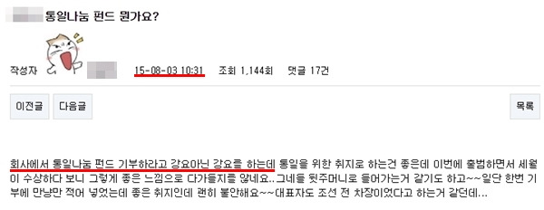 그러나 일부 기업에서는 직원들에게 기부금 약정을 강요했다는 주장이 나오고 있다. A사의 B씨는 중기이코노미에 “회사로부터 불이익을 받을까 두려워 어쩔 수 없이 가입을 했다”고 말했다. C사의 D씨도 “회사가 권하니 심리적 부담이 클수 밖에 없다”고 말했다. 인터넷 커뮤니티에도 비슷한 사연이 올라와 있다. 지난 7월23일 한 인터넷커뮤니티에는 “통일나눔펀드 가입 권유를 받았는데 말이 권유지 반 강제가 될 가능성이 크다”는 글이 올라왔고 지난 8월3일 다른 커뮤니티에도 “회사에서 통일나눔펀드에 기부하라고 강요를 한다. 일단 만원을 한다곤 했는데 불안하다”는 글이 이어졌다.