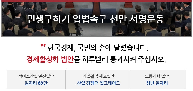 그럼에도 재계는 서비스산업발전법안이 일자리를 69만개 만들고, 기업활력제고법은 산업 경쟁력을 높여주며, 노동개혁법은 청년 일자리를 늘릴 것이라며 법안 통과를 촉구하고 있다. 자신들의 이익을 위한 일이니 하지 말라고는 안하겠다. 다만 ‘청년’이나 ‘민생’ 같은 구호를 내걸며 사실을 왜곡하지는 말라는 것이다. 그 말만 보고 진심으로 나라경제를 걱정하며 서명하는 사람이 나올까 우려스럽다.
