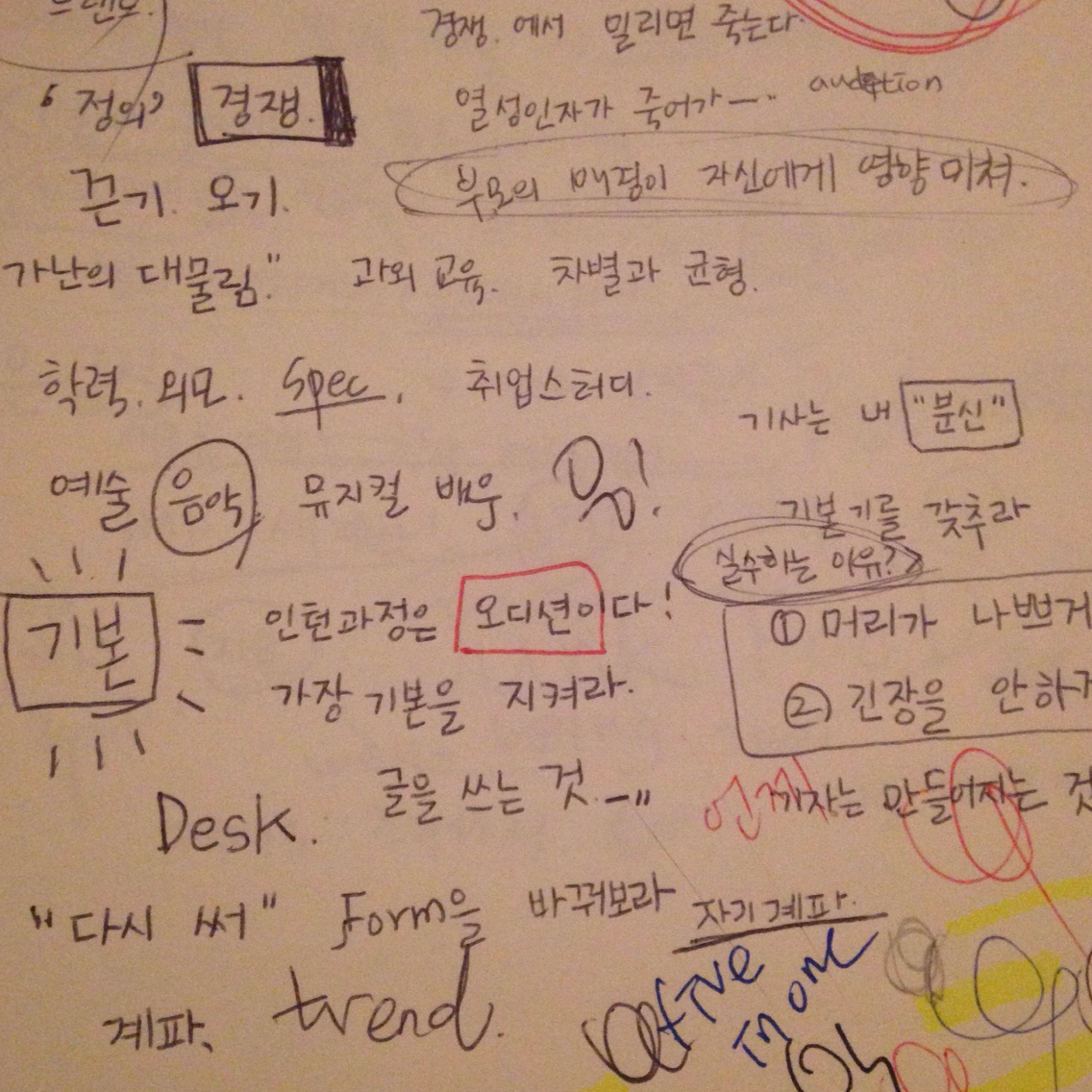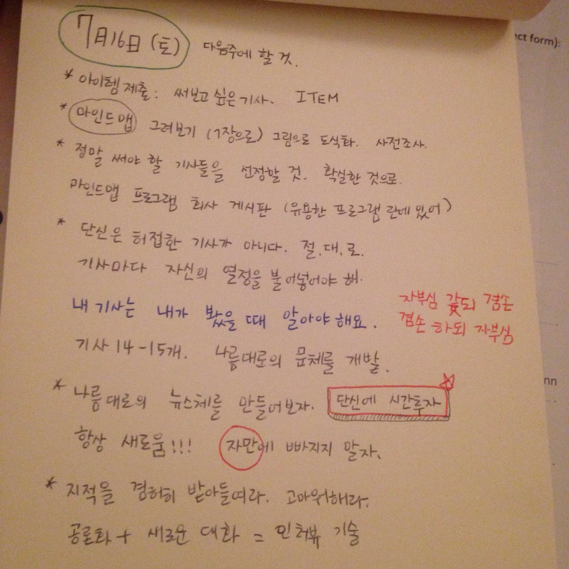 2011년 여름. 토요일에도 밤 늦게까지 일을 했었다. 혼자 컸다고 생각했는데 이 노트를 보니 아니었던 것 같다. 내게 들리는 모든 이야기를 스펀지처럼 빨아들였던 시절이다. 지금 나의 마음가짐은 어떠한가.
