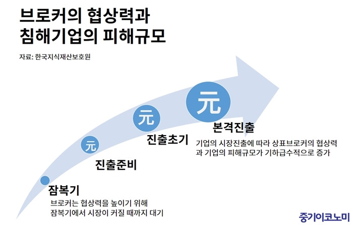 조직적으로 한국 상표만 출원하는 중국 상표 브로커도 있다. 중국 심양신사격림유한공사 김광춘 대표는 회사와 개인 명의로 한국기업 240개의 상표 350개를 출원했다. 풀무원, 하림, 국순당, 천호식품, 네이처리퍼블릭, 귀뚜라미 등이 피해를 입었다. 민 파트장은 “김광춘씨는 유사상표도 아닌 동일상표를 대거 중국에 출원했다. 이들은 죄의식도 없다. 선출원주의 국가에서 먼저 출원하는 건 당연하다며 사업으로 생각한다”고 했다.